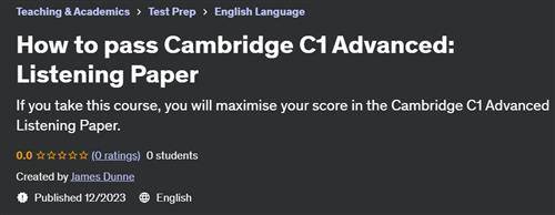 Free Download How to pass Cambridge C1 Advanced - Listening Paper Published 12/2023 Created by James Dunne MP4 | Video: h264, 1280x720 | Audio: AAC, 44.1 KHz, 2 Ch Genre: eLearning | Language: English | Duration: 12 Lectures ( 1h 16m ) | Size: 1.32 GB If you take this course, you will maximise...
